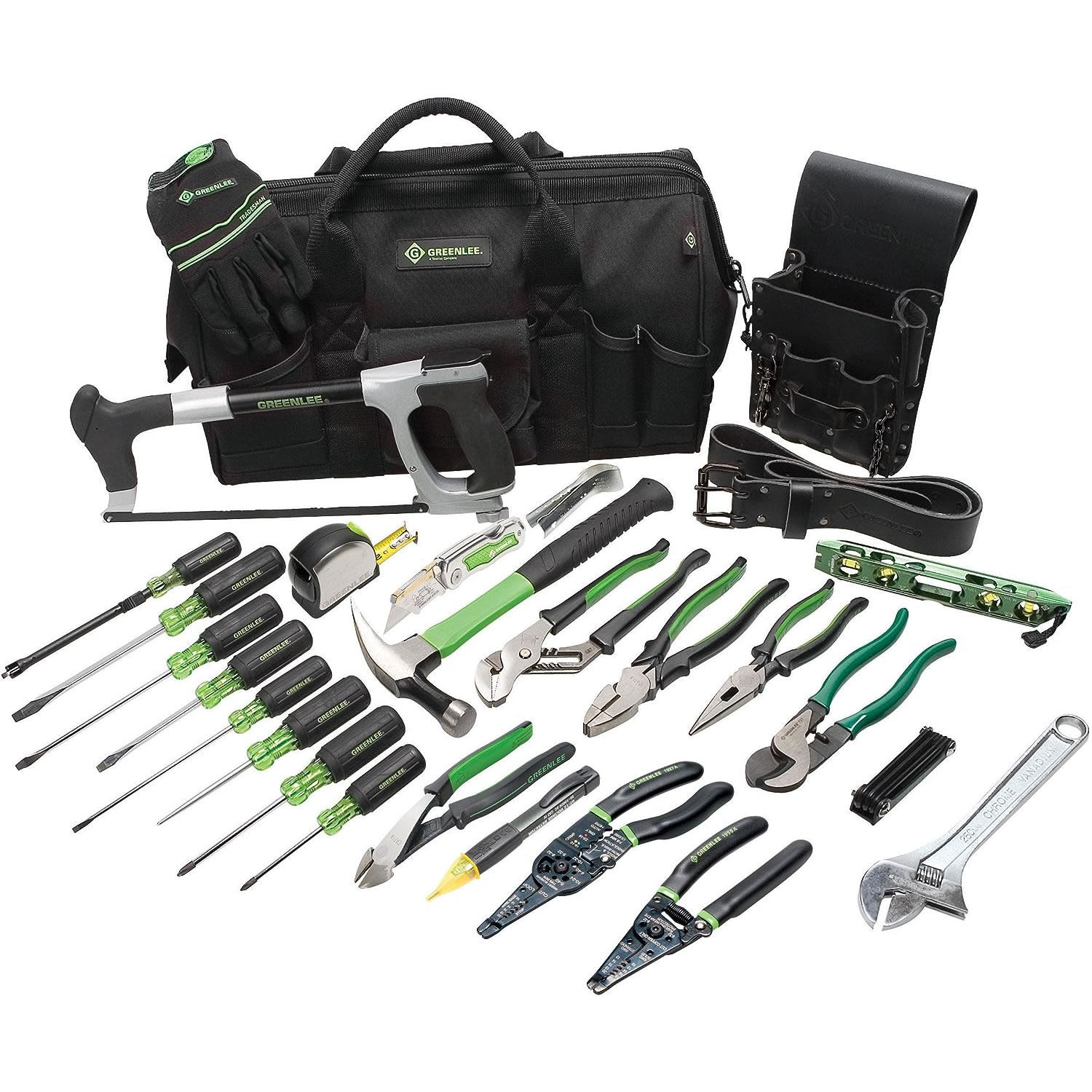Kit de herramientas todo incluido diseñado pensando en el maestro electricista. El kit incluye una bolsa multibolsillos resistente de 18 pulgadas. Bolsa de cuero resistente con 8 bolsillos. Cinturón de herramientas de cuero de dos pulgadas. Alicates de corte lateral de nueve pulgadas. Alicates de corte diagonal de ocho pulgadas. Alicates de punta de ocho pulgadas de largo. Alicates para bombas de diez pulgadas. Pelacables Pro plus 10-18 AWG. Destripador de cables NM, herramienta combinada para pelar y engarzar. Cortador de cables, navaja plegable, sierra para metales de 12 pulgadas, vástago cuadrado con punta trapezoidal de 1/4 de pulgada por 4 pulgadas. Destornillador de punta plana. Vástago cuadrado con punta Keystone de 5/16 pulgadas por 6 pulgadas. Destornillador de punta plana, vástago redondo con punta de gabinete de 3/16 de pulgada por 6 pulgadas. Destornillador de punta plana. Vástago redondo con punta de gabinete de 1/4 de pulgada por 6 pulgadas. Destornillador de punta plana, punta Phillips n.° 1 – 3/16 de pulgada por 3 pulgadas. Destornillador, punta Phillips n.° 2: 1/4 de pulgada por 4 pulgadas. Destornillador, destornillador de sujeción de tornillos de 3/16 pulgadas por 6 pulgadas. Punzón de tres pulgadas. Llave ajustable de diez pulgadas. Juego de llaves hexagonales plegables de nueve piezas. Cinta métrica de veinticinco pies, nivel de torpedo, 18 onzas. Martillo de electricista, guantes de alta destreza, tamaño grande y probador de voltaje GT-11.