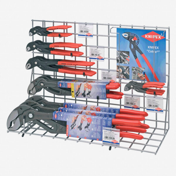 Expositor equipado con tenazas para bombas de agua KNIPEX Cobra®. Sólido- se puede fijar en expositor mural, también válido como expositor de sobremesa. Dimensiones (A x A x P): 610 x 380 x 260 mm. Chapa / alambre de acero, con recubrimiento de pintura pulverizada, color negro. Sólido- se puede fijar en expositor mural, también válido como expositor de sobremesa. . Expositor equipado con tenazas para bombas de agua KNIPEX Cobra®.